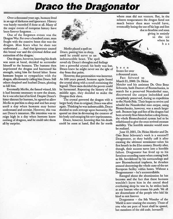 Draco--the World's only Mutant, Bionic Mechanical, Fire-Breathing Creature with Jaws of Steel. The only one in the world of its kind! There is no other mechanical creature that can do all the thinks that are combined in the characteristics of Draco--unlike any other.
