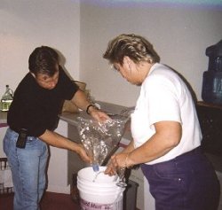 At day 45, the customer is called and notified that his/her wine is ready for bottling. The Grape Escape will supply bottles if necessary at a modest price, or the customer may supply his own. Corks are provided, but labels and decorative foils are optional items. The customer makes an appointment to bottle his product under the watchful guiding eyes of the staff.
