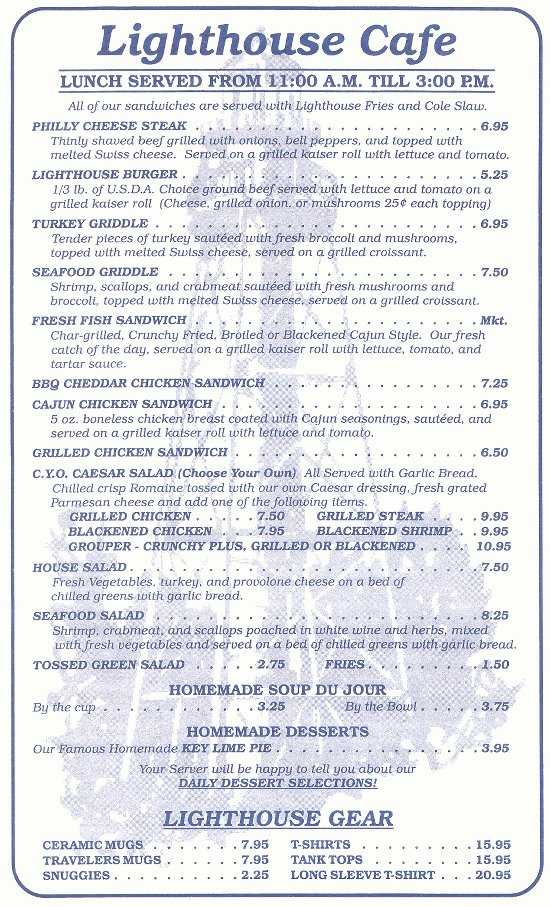 LUNCH MENU Menu Page | Home Page Lighthouse Cafe 362 Periwinkle Way Sanibel Island FL 33957 (941) 472-0303 Email: mbillhe349@aol.com